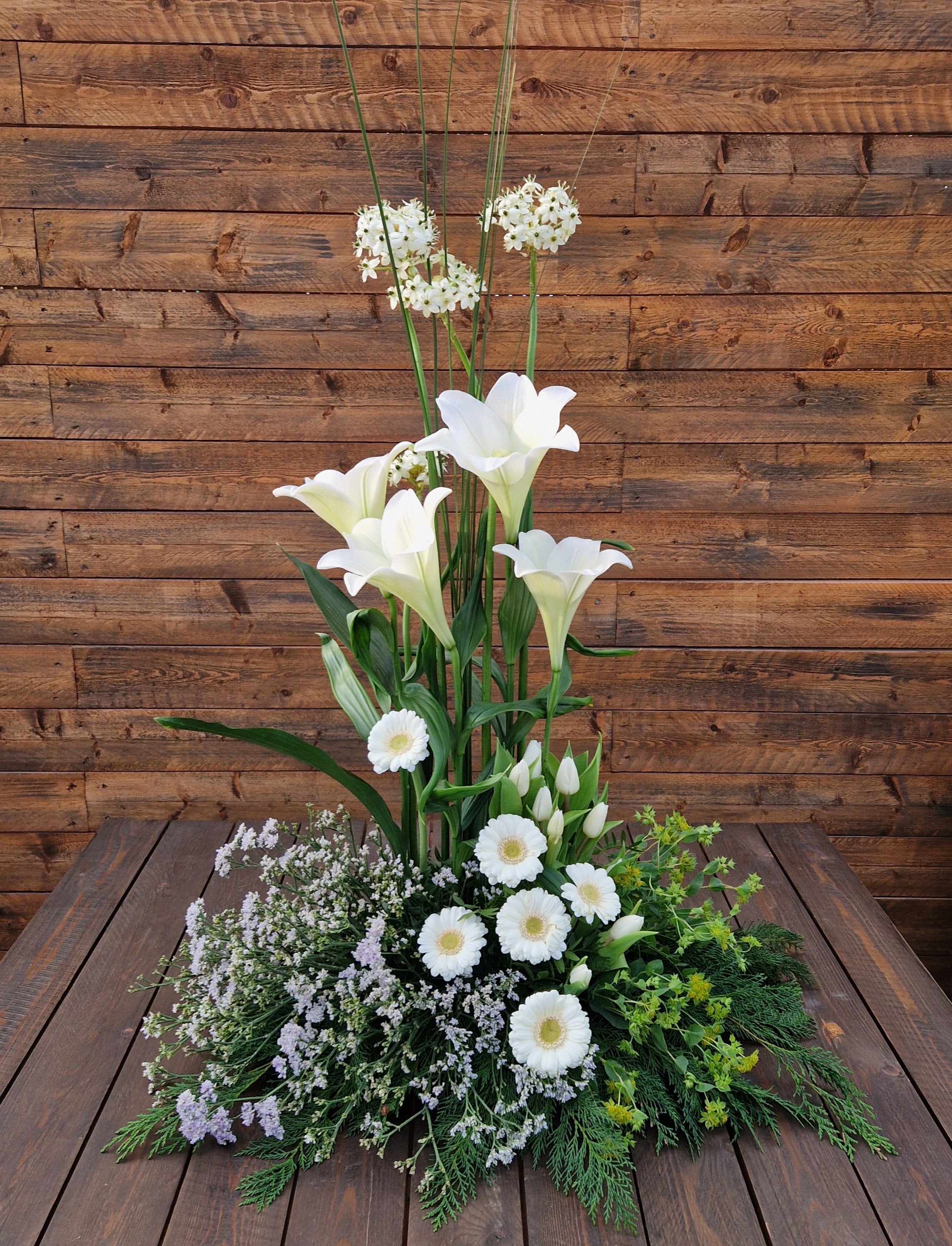 Denna dekoration i ljusa toner med bland annat ornithogalum, liljor och germini är hög och stilren.