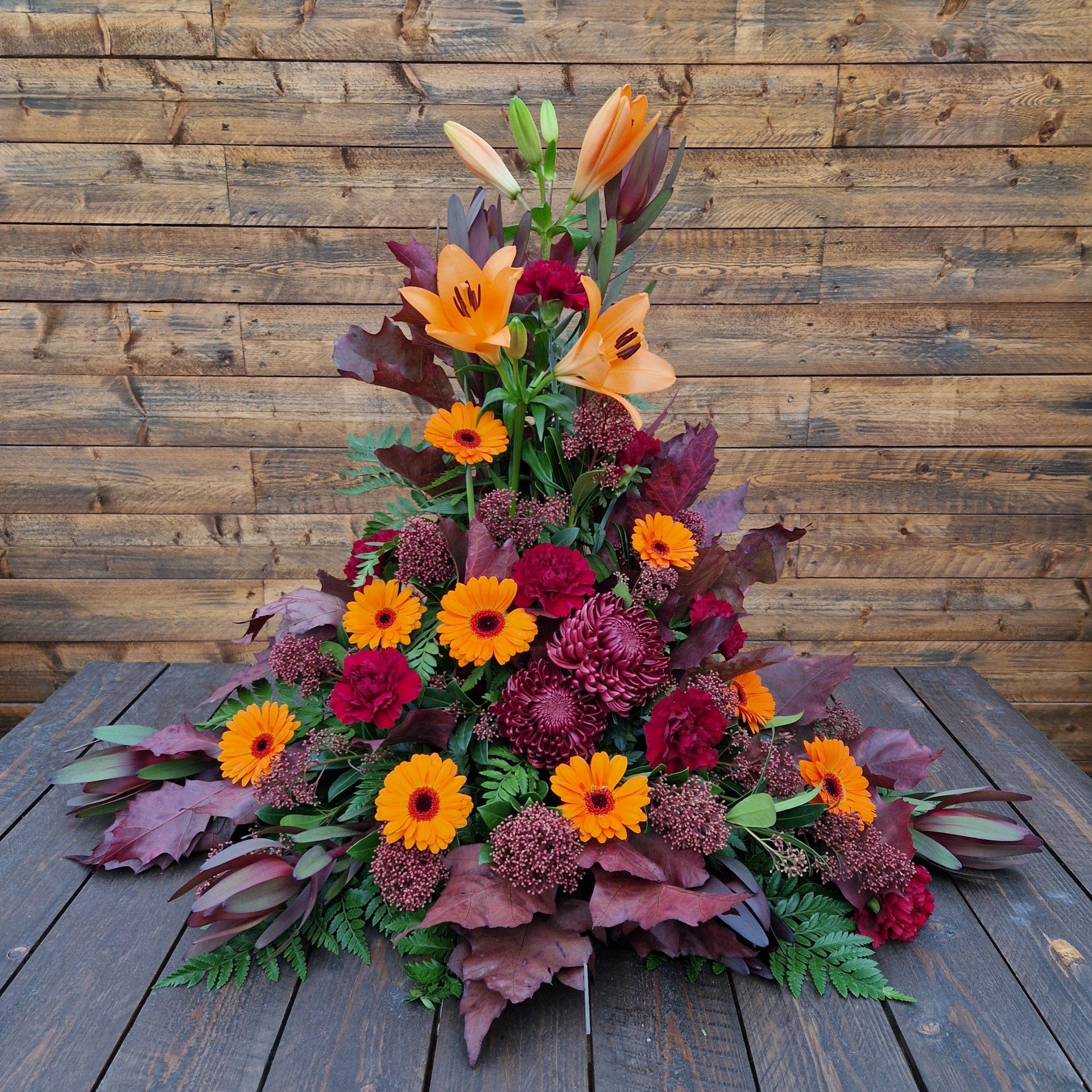 En exklusiv och uttrycksfull dekoration som förmedlar djup kärlek och tacksamhet. Rika blomster i höjd och form ger ett imponerande och fridfullt intryck – ett minnesmärke av värdighet och närvaro.