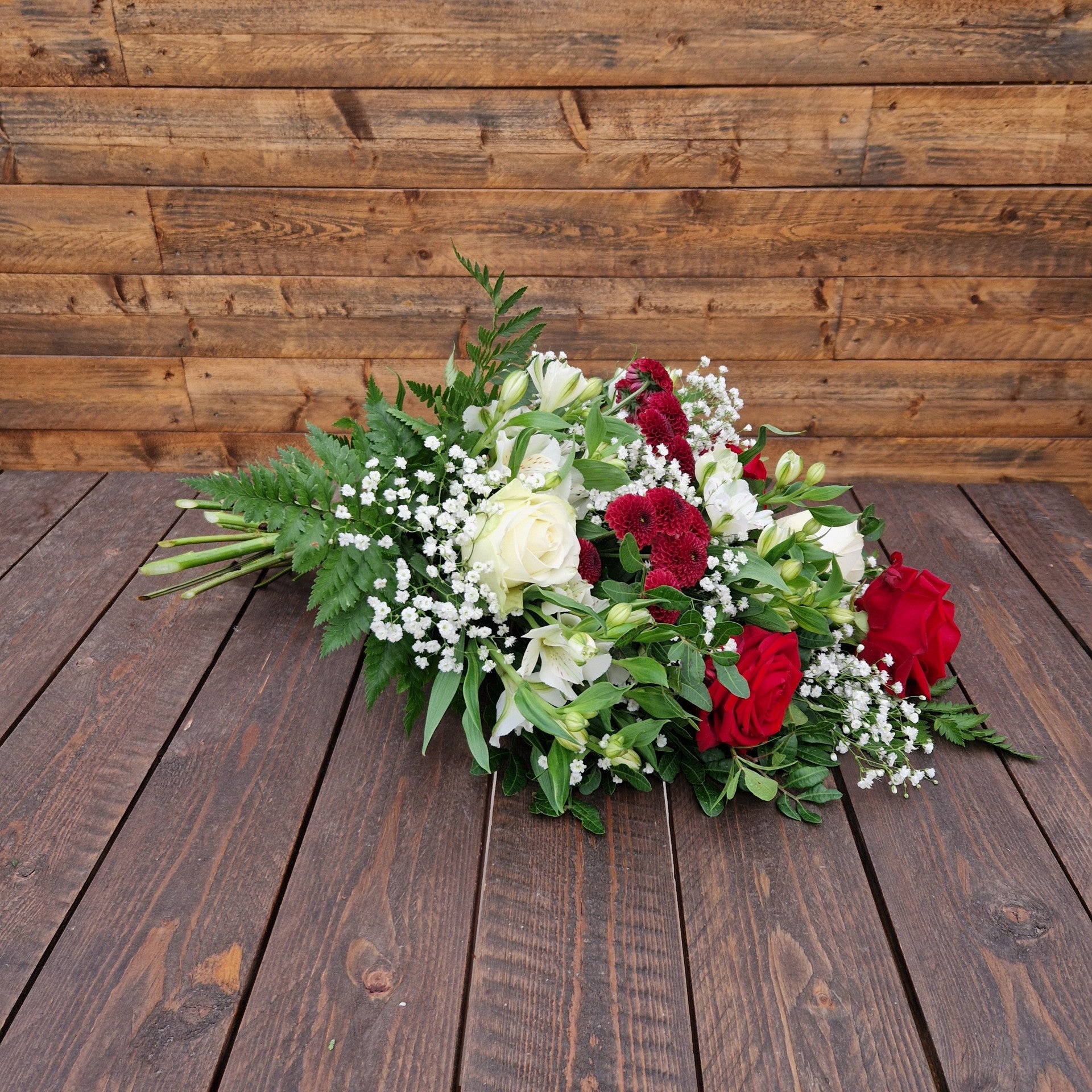 En exklusiv och fyllig bukett med eleganta blommor i harmonisk komposition. Symboliserar kärlek, vördnad och ett värdigt avsked. Varje blomma väljs med omtanke för att skapa en känsla av frid och närvaro.