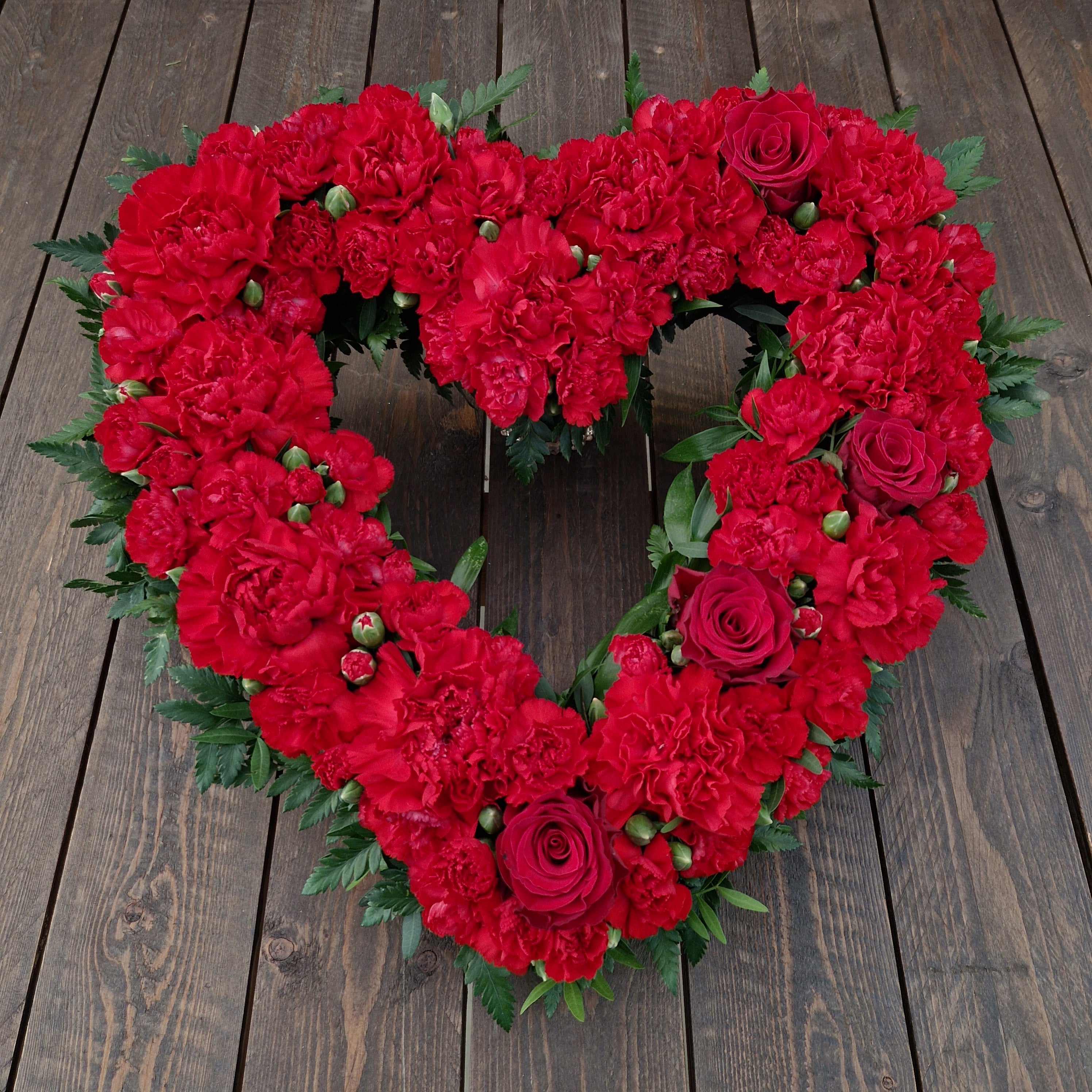 Ett hjärta med några rosor och olika nejlikor som tillsammans skapar en fin harmoni. 45 cm i diameter.