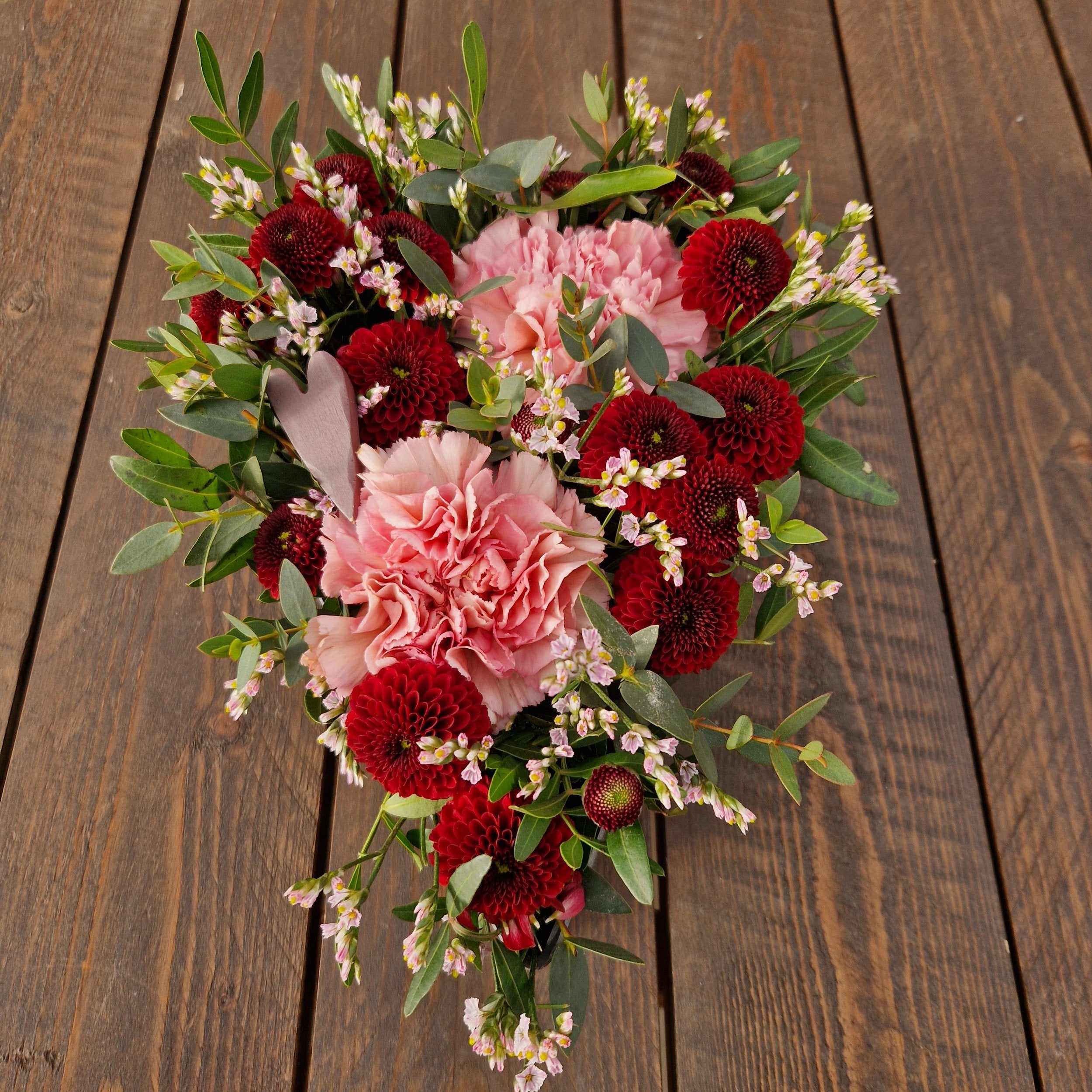 Hjärtformad skål fylld med blommor i röda och rosa toner. Hållbar och allergivänlig.
