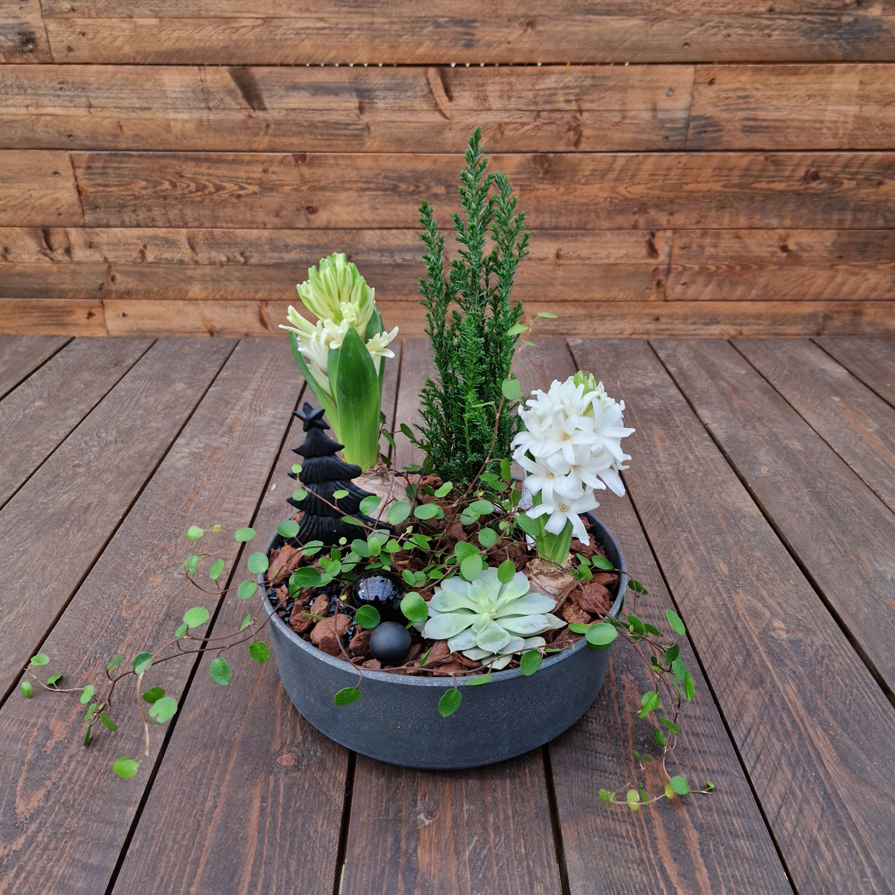En stilren blomgrupp framtagen för dig som vill ge hemmet en känsla av modernare jul men med en klassisk doft av hyacint. Lilla karlavagnen har ljusa toner med en mörkgrå skål tillverkad av biologiskt nedbrytbart material. Perfekt som present eller personlig dekoration. Bra miljöval! Endast lokal utkörning.