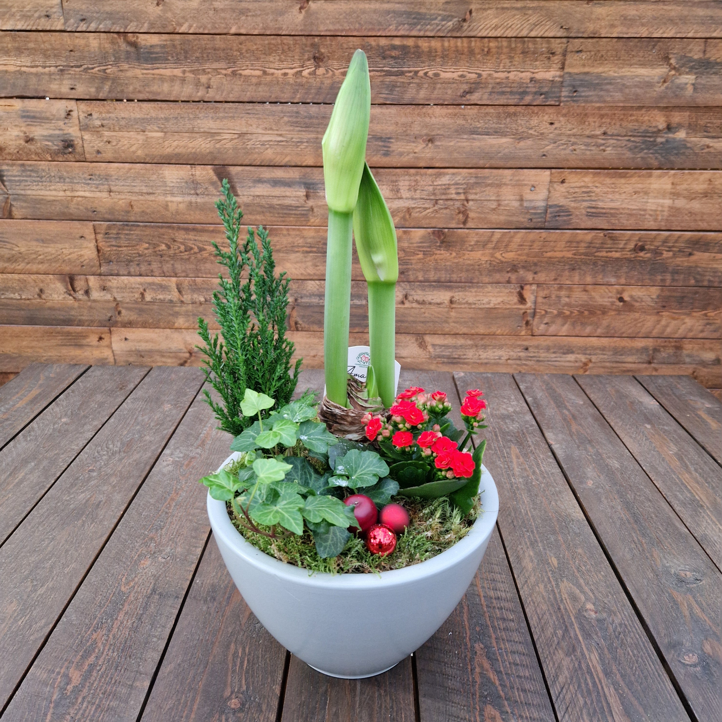 En stilren och modern blomgrupp med tydlig karaktär framtagen för dig som vill ge hemmet en känsla av jul med klassiska blommor. Orion har ljusa toner med en grå keramikskål. Perfekt som present eller personlig dekoration.
