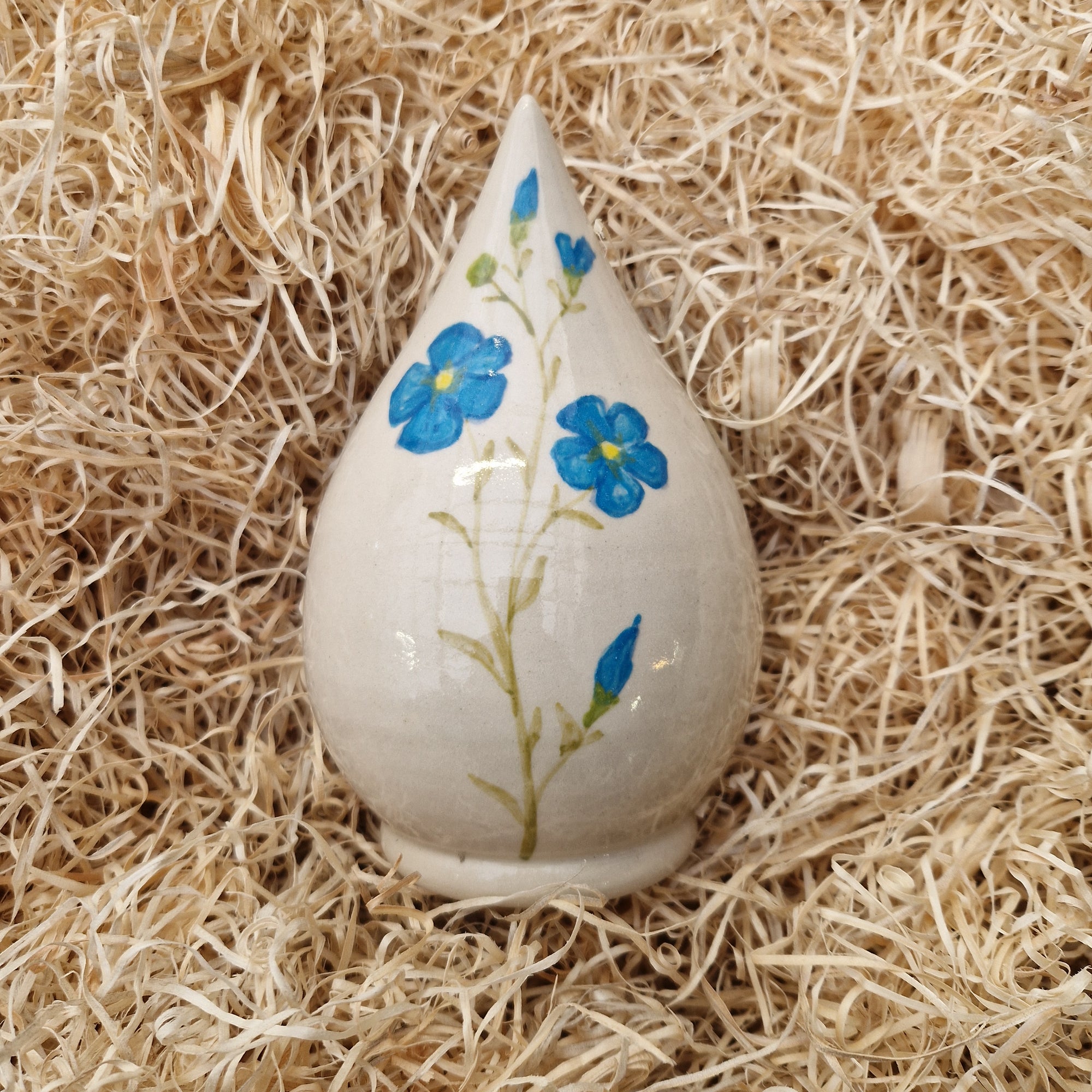 Handdrejad trädgårdsspira vackert dekorerad med hälsinglands landskapsblomma, linblomman. Ca 12 cm på höjden.