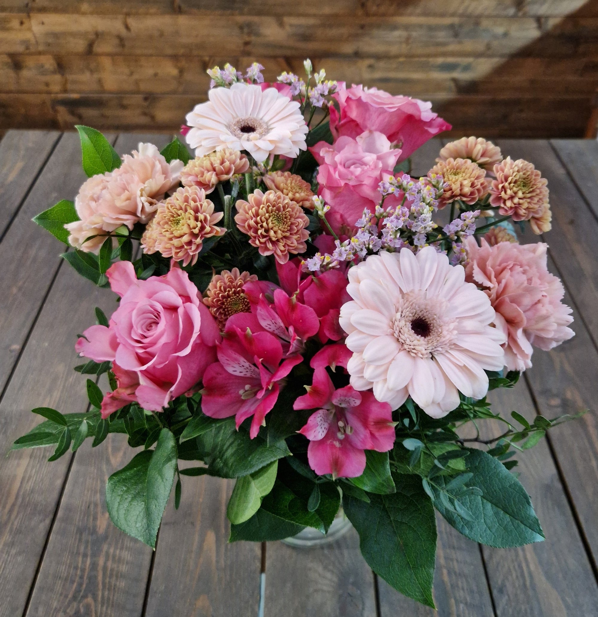 Rundbunden bukett i rosa toner. Vas finns som tillval i beställningsformuläret. (Bilden visar Mellanstor)