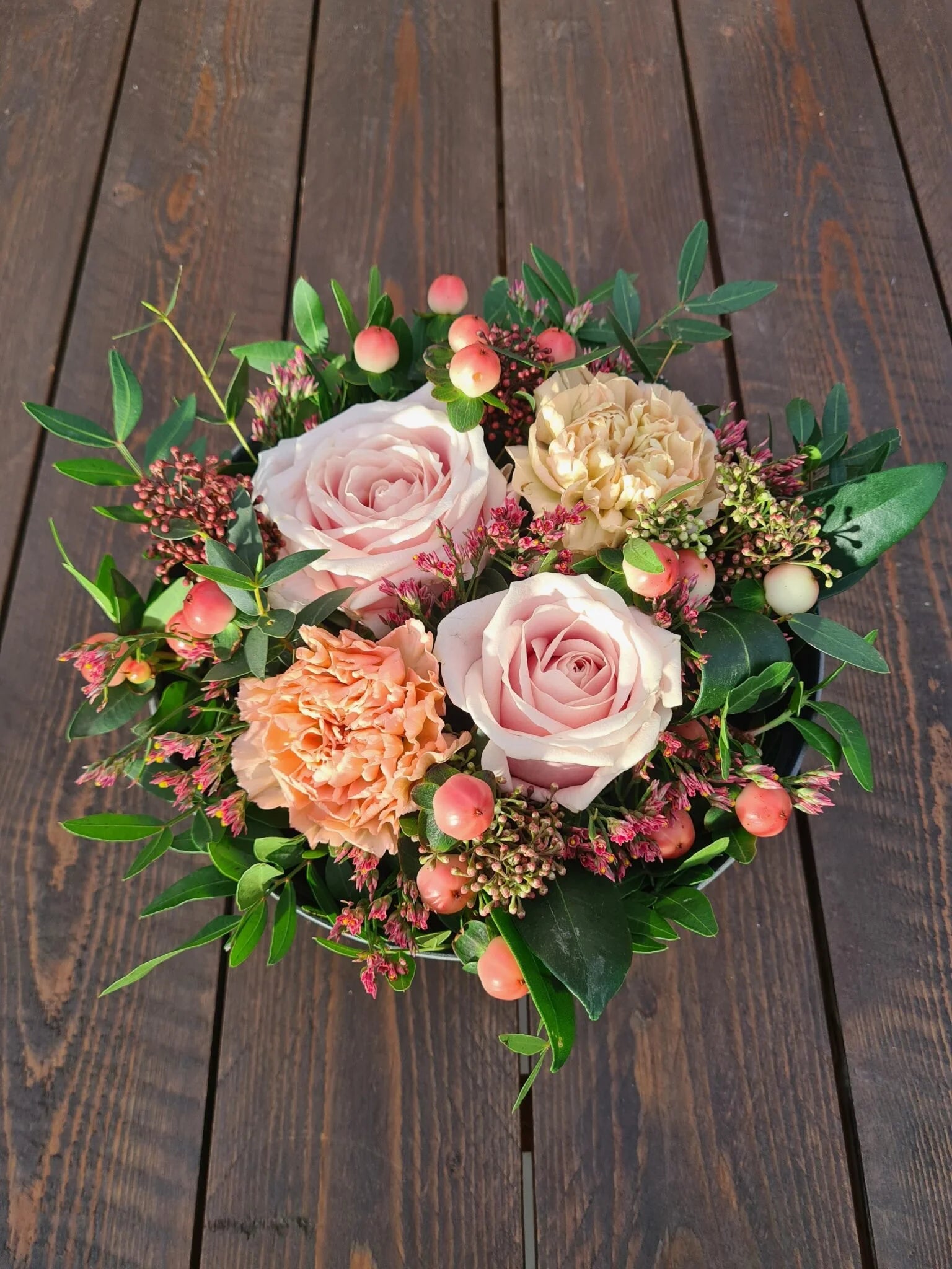 Skål med blommor i olika rosa toner. Hållbar och allergivänlig.