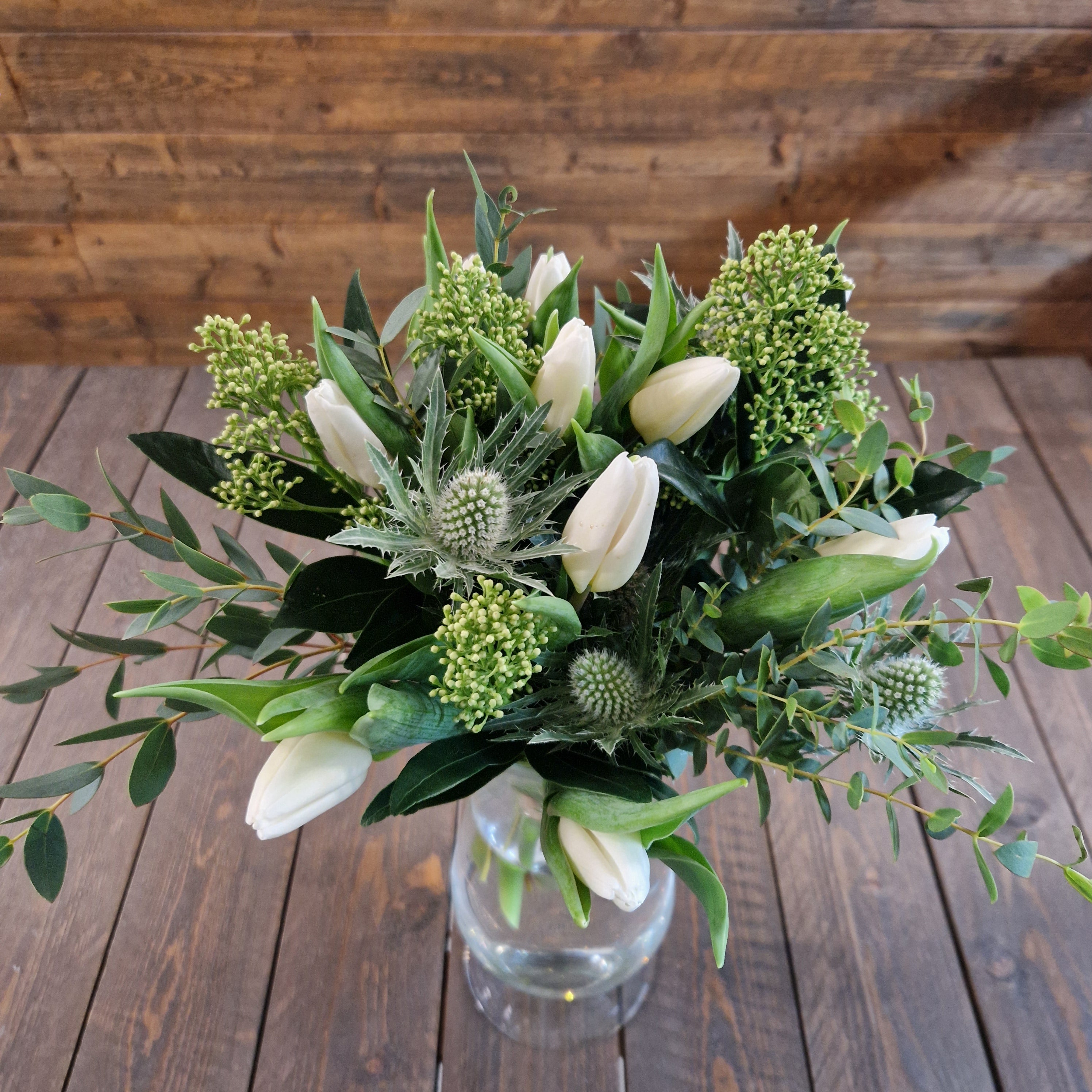 Bukett med bland annat vita tulpaner och grön skimmia.
